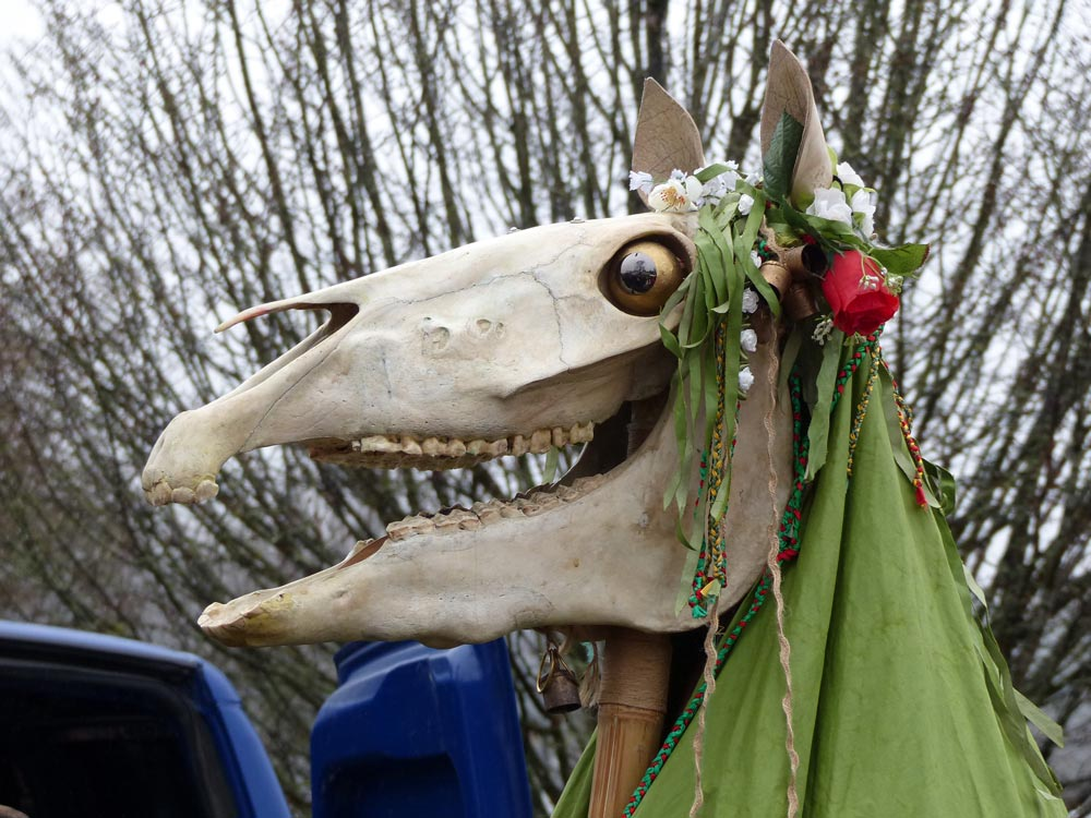 The Mari Lwyd is a Welsh wassailing tradition dating back centuries where a horse’s skull is mounted on a pole, draped in white cloth, and decorated with ribbons and glass eyes. Groups carry it door to door during the Christmas season, demanding entry through song. Householders must respond in verse, trading rhymes until one side relents.